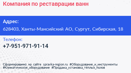 Компания по реставрации ванн по адресу 628403, Ханты-Мансийский АО, Сургут, Сибирская, 18 в дальнейшем Организация, размещена в следующих категориях:
