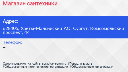 Магазин сантехники по адресу 628405, Ханты-Мансийский АО, Сургут, Комсомольский проспект, 44 в дальнейшем Организация, размещена в следующих категориях: