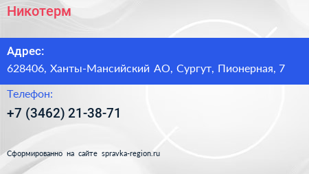 Никотерм по адресу 628406, Ханты-Мансийский АО, Сургут, Пионерная, 7 в дальнейшем Организация, размещена в следующих категориях: