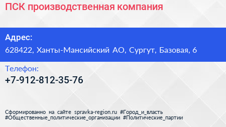 ПСК, производственная компания по адресу 628422, Ханты-Мансийский АО, Сургут, Базовая, 6 в дальнейшем Организация, размещена в следующих категориях: