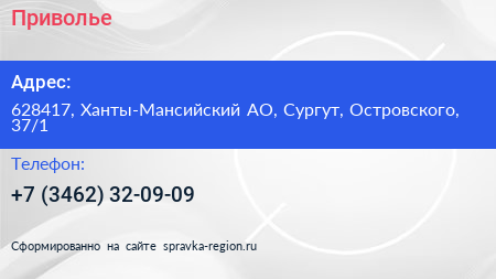 Приволье по адресу 628417, Ханты-Мансийский АО, Сургут, Островского, 37/1 в дальнейшем Организация, размещена в следующих категориях:
