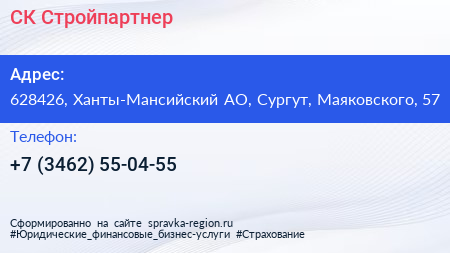 СК Стройпартнер по адресу 628426, Ханты-Мансийский АО, Сургут, Маяковского, 57 в дальнейшем Организация, размещена в следующих категориях: