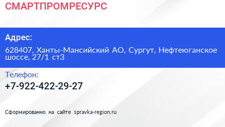 СМАРТПРОМРЕСУРС по адресу 628407, Ханты-Мансийский АО, Сургут, Нефтеюганское шоссе, 27/1 ст3 в дальнейшем Организация, размещена в следующих категориях: