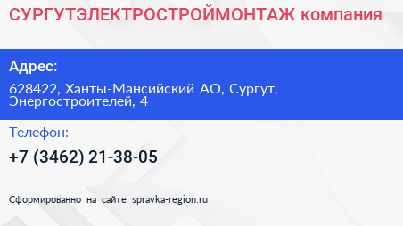 СУРГУТЭЛЕКТРОСТРОЙМОНТАЖ, компания по адресу 628422, Ханты-Мансийский АО, Сургут, Энергостроителей, 4 в дальнейшем Организация, размещена в следующих категориях: