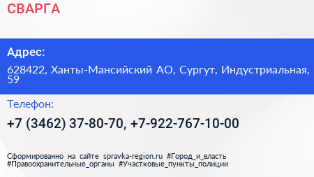 СВАРГА по адресу 628422, Ханты-Мансийский АО, Сургут, Индустриальная, 59 в дальнейшем Организация, размещена в следующих категориях: