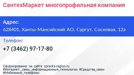 СантехМаркет, многопрофильная компания по адресу 628401, Ханты-Мансийский АО, Сургут, Сосновая, 12а в дальнейшем Организация, размещена в следующих категориях: