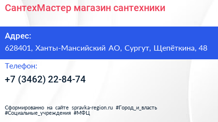 СантехМастер, магазин сантехники по адресу 628401, Ханты-Мансийский АО, Сургут, Щепёткина, 48 в дальнейшем Организация, размещена в следующих категориях: