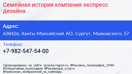 Семейная история, компания экспресс дизайна по адресу 628426, Ханты-Мансийский АО, Сургут, Маяковского, 57 в дальнейшем Организация, размещена в следующих категориях: