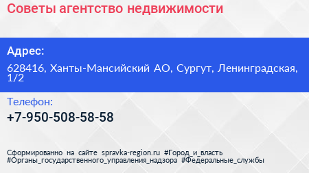 Советы, агентство недвижимости по адресу 628416, Ханты-Мансийский АО, Сургут, Ленинградская, 1/2 в дальнейшем Организация, размещена в следующих категориях: