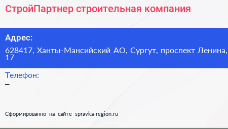 СтройПартнер, строительная компания по адресу 628417, Ханты-Мансийский АО, Сургут, проспект Ленина, 17 в дальнейшем Организация, размещена в следующих категориях: