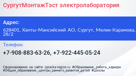СургутМонтажТэст, электролаборатория по адресу 628401, Ханты-Мансийский АО, Сургут, Мелик-Карамова, 28/2 в дальнейшем Организация, размещена в следующих категориях: