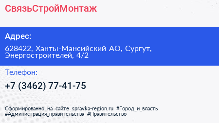 СвязьСтройМонтаж по адресу 628422, Ханты-Мансийский АО, Сургут, Энергостроителей, 4/2 в дальнейшем Организация, размещена в следующих категориях: