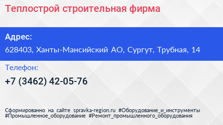 Теплострой, строительная фирма по адресу 628403, Ханты-Мансийский АО, Сургут, Трубная, 14 в дальнейшем Организация, размещена в следующих категориях:
