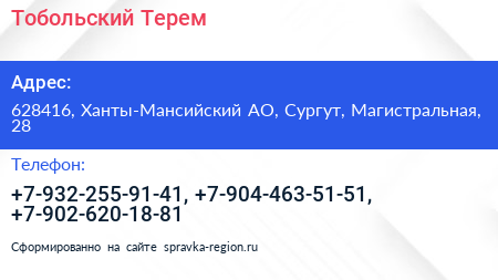 Тобольский Терем по адресу 628416, Ханты-Мансийский АО, Сургут, Магистральная, 28 в дальнейшем Организация, размещена в следующих категориях: