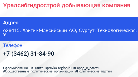 Уралсибгидрострой, добывающая компания по адресу 628415, Ханты-Мансийский АО, Сургут, Технологическая, 9 в дальнейшем Организация, размещена в следующих категориях: