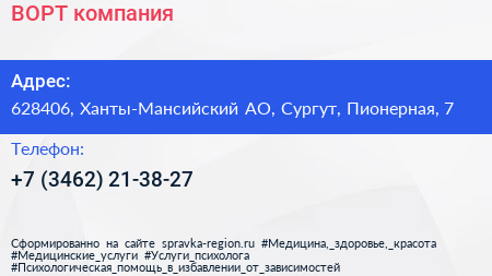ВОРТ, компания по адресу 628406, Ханты-Мансийский АО, Сургут, Пионерная, 7 в дальнейшем Организация, размещена в следующих категориях: