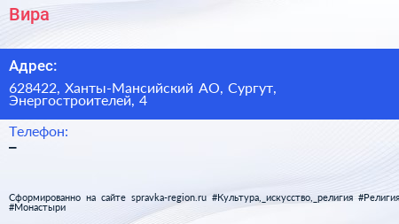 Вира по адресу 628422, Ханты-Мансийский АО, Сургут, Энергостроителей, 4 в дальнейшем Организация, размещена в следующих категориях: