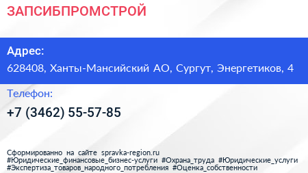ЗАПСИБПРОМСТРОЙ по адресу 628408, Ханты-Мансийский АО, Сургут, Энергетиков, 4 в дальнейшем Организация, размещена в следующих категориях: