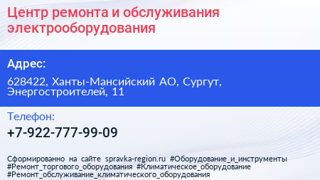 Центр ремонта и обслуживания электрооборудования по адресу 628422, Ханты-Мансийский АО, Сургут, Энергостроителей, 11 в дальнейшем Организация, размещена в следующих категориях: