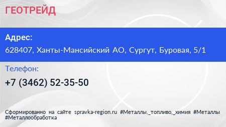 ГЕОТРЕЙД по адресу 628407, Ханты-Мансийский АО, Сургут, Буровая, 5/1 в дальнейшем Организация, размещена в следующих категориях: