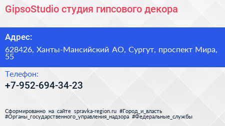 GipsoStudio, студия гипсового декора по адресу 628426, Ханты-Мансийский АО, Сургут, проспект Мира, 55 в дальнейшем Организация, размещена в следующих категориях: