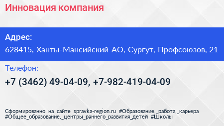 Инновация, компания по адресу 628415, Ханты-Мансийский АО, Сургут, Профсоюзов, 21 в дальнейшем Организация, размещена в следующих категориях:
