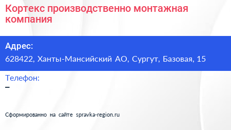 Кортекс, производственно-монтажная компания по адресу 628422, Ханты-Мансийский АО, Сургут, Базовая, 15 в дальнейшем Организация, размещена в следующих категориях:
