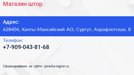 Магазин штор по адресу 628404, Ханты-Мансийский АО, Сургут, Аэрофлотская, 8 в дальнейшем Организация, размещена в следующих категориях: