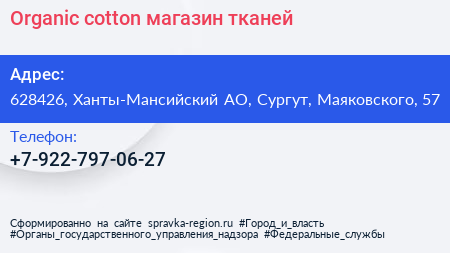 Organic cotton, магазин тканей по адресу 628426, Ханты-Мансийский АО, Сургут, Маяковского, 57 в дальнейшем Организация, размещена в следующих категориях: