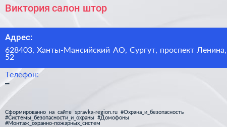 Виктория, салон штор по адресу 628403, Ханты-Мансийский АО, Сургут, проспект Ленина, 52 в дальнейшем Организация, размещена в следующих категориях: