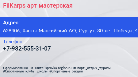FilKarps, арт-мастерская по адресу 628406, Ханты-Мансийский АО, Сургут, 30 лет Победы, 41 в дальнейшем Организация, размещена в следующих категориях: