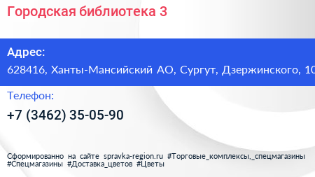 Городская библиотека №3 по адресу 628416, Ханты-Мансийский АО, Сургут, Дзержинского, 10 в дальнейшем Организация, размещена в следующих категориях: