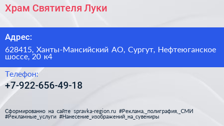 Храм Святителя Луки по адресу 628415, Ханты-Мансийский АО, Сургут, Нефтеюганское шоссе, 20 к4 в дальнейшем Организация, размещена в следующих категориях: