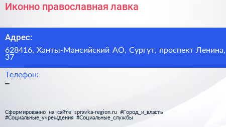 Иконно-православная лавка по адресу 628416, Ханты-Мансийский АО, Сургут, проспект Ленина, 37 в дальнейшем Организация, размещена в следующих категориях: