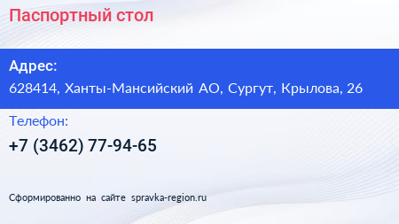 Паспортный стол по адресу 628414, Ханты-Мансийский АО, Сургут, Крылова, 26 в дальнейшем Организация, размещена в следующих категориях: