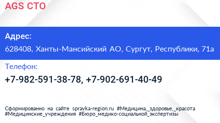 AGS, СТО по адресу 628408, Ханты-Мансийский АО, Сургут, Республики, 71а в дальнейшем Организация, размещена в следующих категориях: