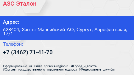 АЗС Эталон по адресу 628404, Ханты-Мансийский АО, Сургут, Аэрофлотская, 17/1 в дальнейшем Организация, размещена в следующих категориях:
