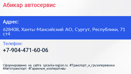 Абикар, автосервис по адресу 628408, Ханты-Мансийский АО, Сургут, Республики, 71 ст4 в дальнейшем Организация, размещена в следующих категориях: