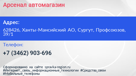 Арсенал, автомагазин по адресу 628426, Ханты-Мансийский АО, Сургут, Профсоюзов, 39/1 в дальнейшем Организация, размещена в следующих категориях: