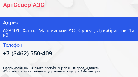 АртСевер, АЗС по адресу 628401, Ханты-Мансийский АО, Сургут, Декабристов, 1а к3 в дальнейшем Организация, размещена в следующих категориях: