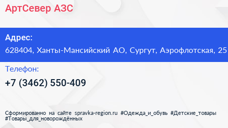 АртСевер, АЗС по адресу 628404, Ханты-Мансийский АО, Сургут, Аэрофлотская, 25 в дальнейшем Организация, размещена в следующих категориях:
