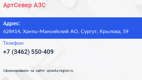 АртСевер, АЗС по адресу 628414, Ханты-Мансийский АО, Сургут, Крылова, 59 в дальнейшем Организация, размещена в следующих категориях: