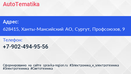 АutoТematika по адресу 628415, Ханты-Мансийский АО, Сургут, Профсоюзов, 9 в дальнейшем Организация, размещена в следующих категориях: