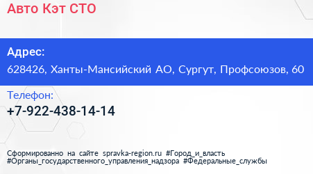 Авто-Кэт, СТО по адресу 628426, Ханты-Мансийский АО, Сургут, Профсоюзов, 60 в дальнейшем Организация, размещена в следующих категориях: