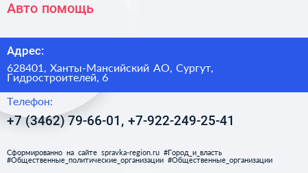Авто-помощь по адресу 628401, Ханты-Мансийский АО, Сургут, Гидростроителей, 6 в дальнейшем Организация, размещена в следующих категориях: