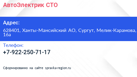 АвтоЭлектрик, СТО по адресу 628401, Ханты-Мансийский АО, Сургут, Мелик-Карамова, 16а в дальнейшем Организация, размещена в следующих категориях: