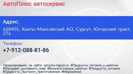 АвтоПлюс, автосервис по адресу 628401, Ханты-Мансийский АО, Сургут, Югорский тракт, 27а в дальнейшем Организация, размещена в следующих категориях: