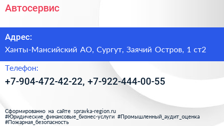 Автосервис по адресу Ханты-Мансийский АО, Сургут, Заячий Остров, 1 ст2 в дальнейшем Организация, размещена в следующих категориях:
