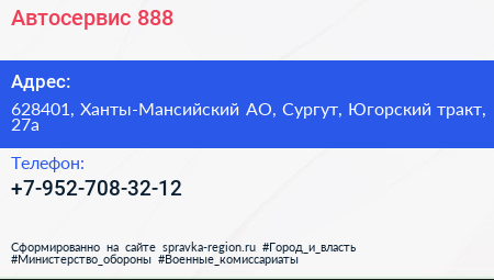 Автосервис 888 по адресу 628401, Ханты-Мансийский АО, Сургут, Югорский тракт, 27а в дальнейшем Организация, размещена в следующих категориях: