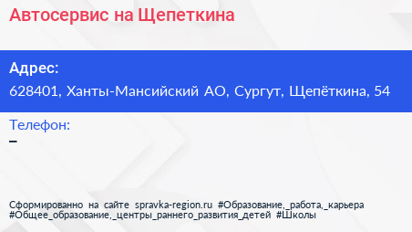 Автосервис на Щепеткина по адресу 628401, Ханты-Мансийский АО, Сургут, Щепёткина, 54 в дальнейшем Организация, размещена в следующих категориях: